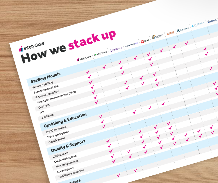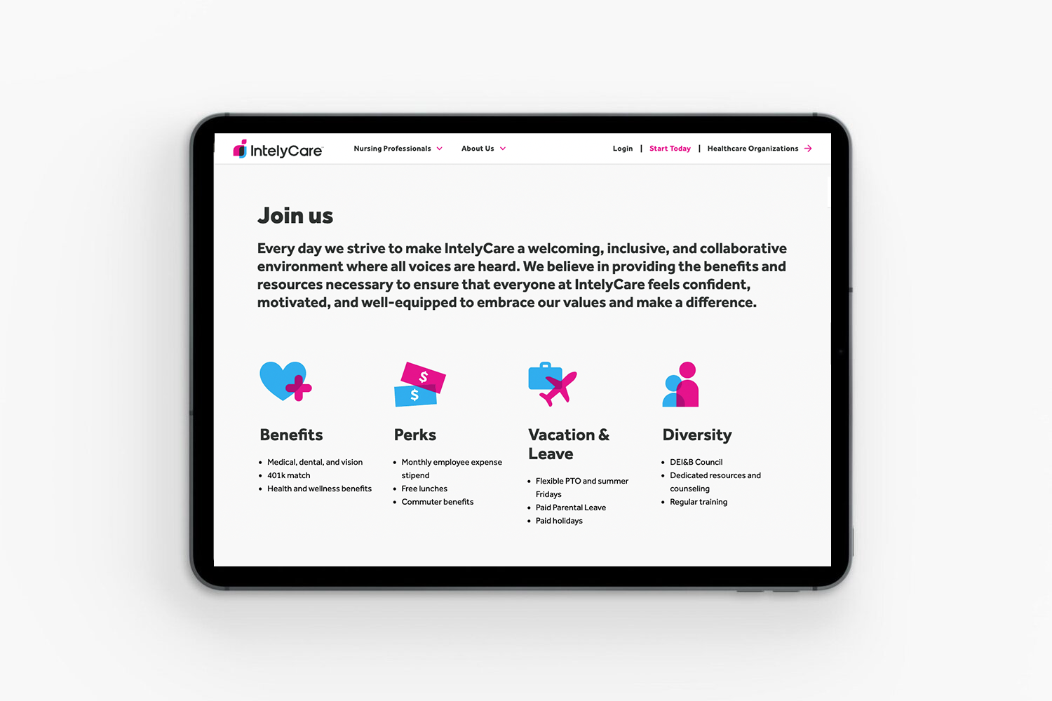 IntelyCare is a billion dollar nursing talent platform that caters to a pool of over 30,000 nursing professionals and partnering facilities. IntelyCare wanted to differentiate themselves from competitors with a complete rebrand. We conducted in-depth market research and studied trends to inform creative solutions. I art directed the iconography, photography, social posts, print materials, and several video assets for the rebrand.
